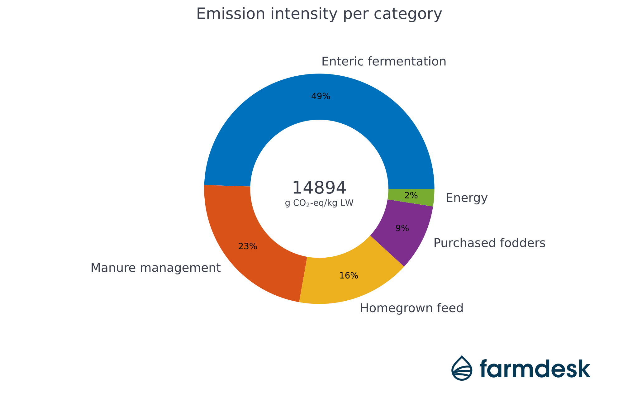 The case farm had total emissions of 16.2 kg CO2-eq per kg of live weight leaving the company in 2024. Enteric fermentation accounted for 7.4 kg CO2-eq/kg LW (45%), followed by manure management with 3.4 kg CO2-eq/kg LW (21%), homegrown feed with 2.9 kg CO2-eq/kg LW (18%), purchased feed with 2.2 kg CO2-eq/kg LW (14%) and energy consumption with 0.3 kg CO2-eq/kg LW (2%).