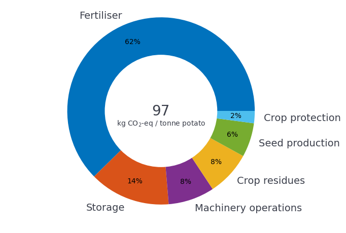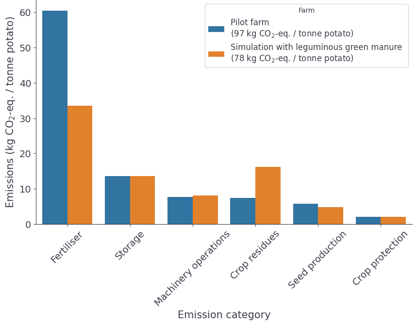 As a final step in this study, we simulated the effect of using nitrogen-fixing green manures as a pre-crop on potatoes, reducing the need for fertilizer. This assumed that nitrogen fertilizer application was reduced by 82 kg N/ha, while potato yield remained the same. The net result is a decrease from 97 kg CO₂-eq/ton to 78 kg CO₂-eq/ton, a total reduction of 19%.