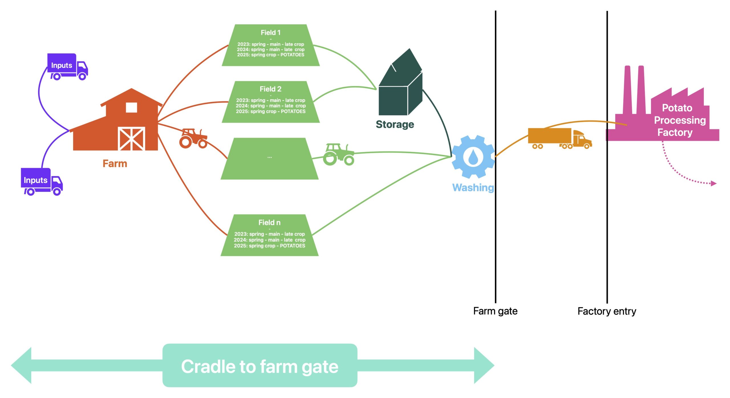 Farmdesk Climate provides the carbon footprint cradle to farm gate, meaning that the carbon footprint is calculated from the origin of all inputs (such as fertilizer production) until the product leaves the farm. In other words, all greenhouse gas emissions directly or indirectly related to agricultural activities on the farm are included in the calculation.