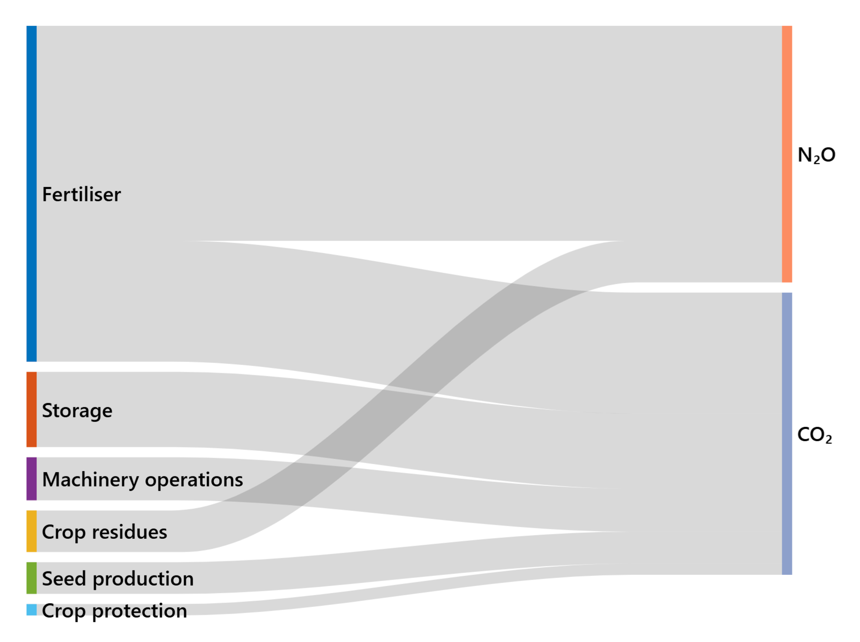 As shown in the figure below, the largest reduction occurs in fertilization: from 61 kg CO₂-eq/ton to 34 kg CO₂-eq/ton, almost a halving. Emissions from machinery operations and crop residues increase slightly, but have a smaller impact.