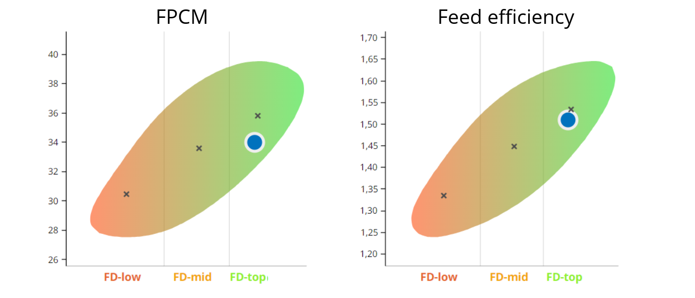 The Farmdesk practical farm (blue dot) scores well in terms of measured milk production (FPCM) per day and in terms of feed efficiency. These are often parallel issues and there is also a clear link between milk production and feed efficiency on the one hand and farm performance on the other.