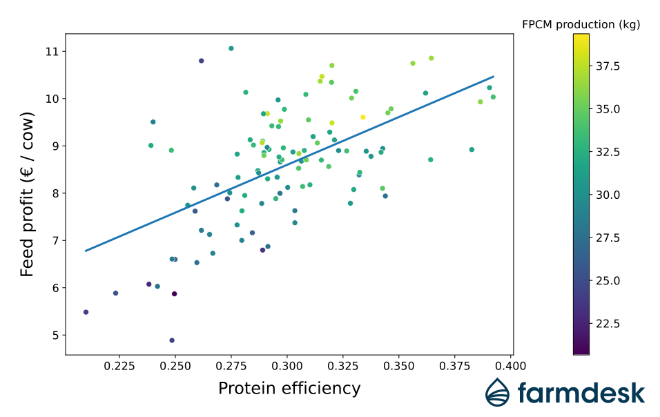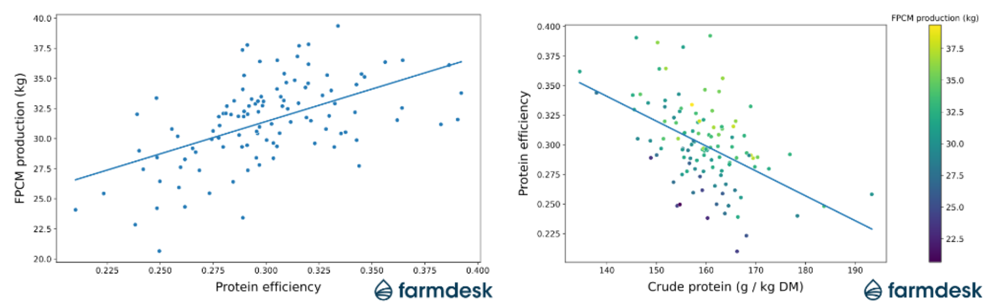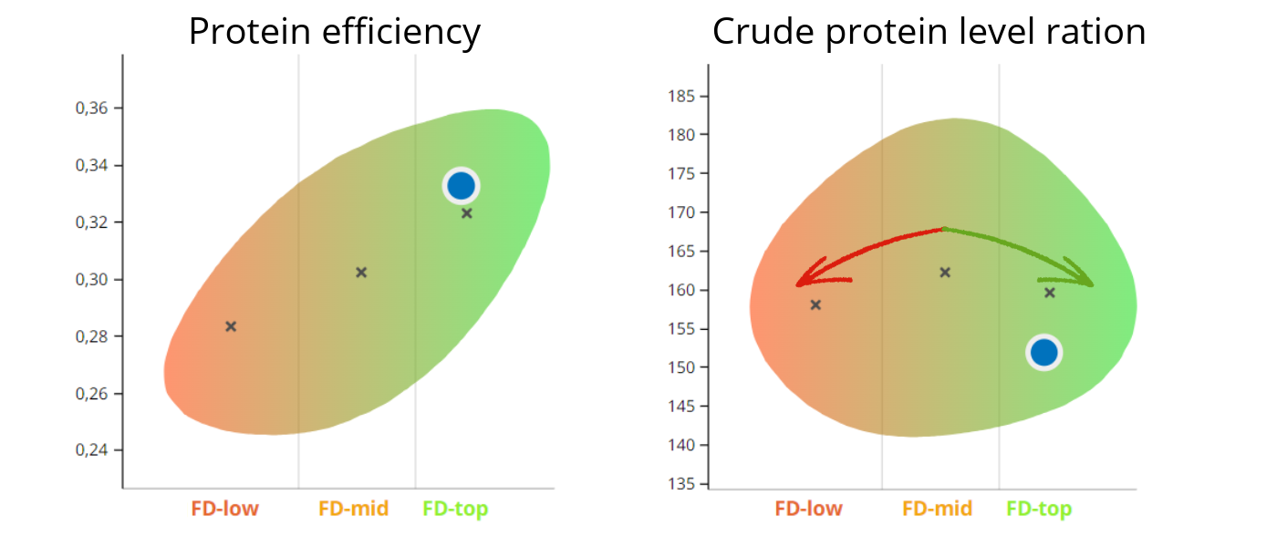 .Protein efficiency is high on average in the FD top group, while protein content in the ration there is relatively low. The Farmdesk practice farm (blue dot) is a living witness to this.