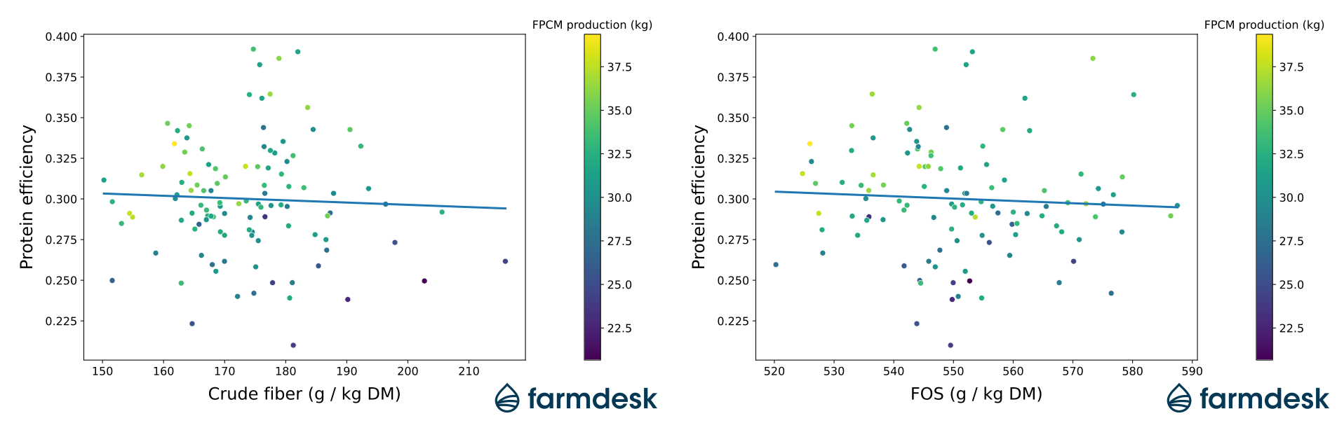 The ration parameters that apparently have a (rather limited) negative effect on protein efficiency are crude fiber and FOS.
