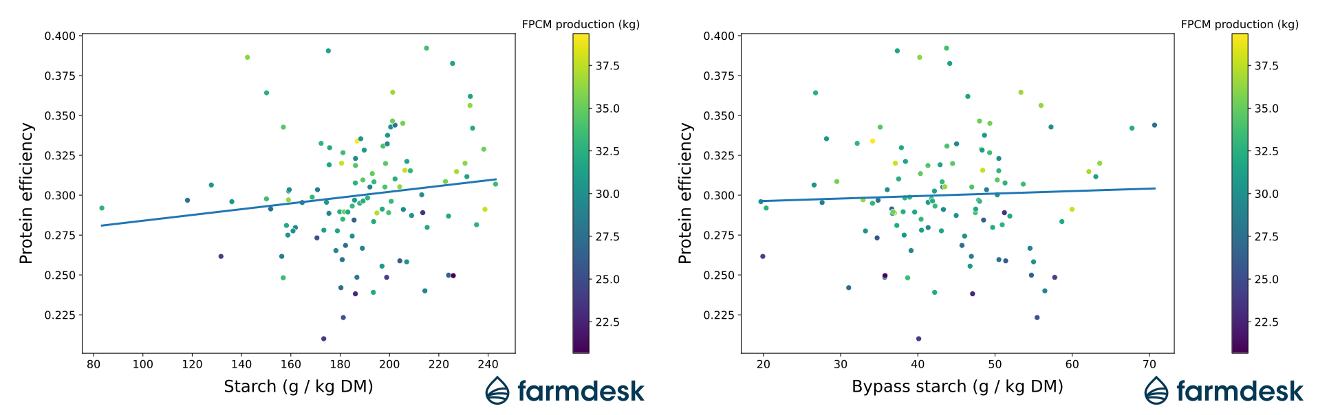 The energy supply also plays a positive role in protein efficiency: more starch in the ration yields better protein utilization. This is more true for total starch content than for resistant starch content, from which we conclude that rumen-level starch is relatively more determinant of protein efficiency. We see here the necessary interplay of protein and energy in protein digestion nicely illustrated.