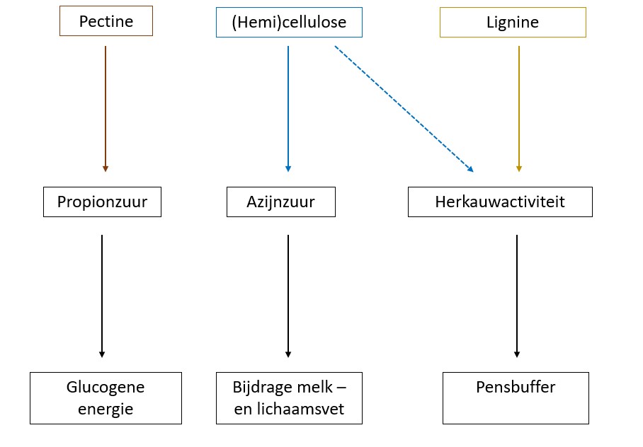 Cellulose en hemicellulose zijn bestandsdelen van de primaire celwand en zijn verteerbaar door de pensflora. Deze componenten worden voornamelijk omgezet tot azijnzuur, dat via de penswand in het bloed opgenomen wordt om uiteindelijk een belangrijke bijdrage te leveren tot het melk- en lichaamsvet. Daarnaast kunnen deze componenten ook bijdragen tot de noodzakelijke mechanische prik in de pens.