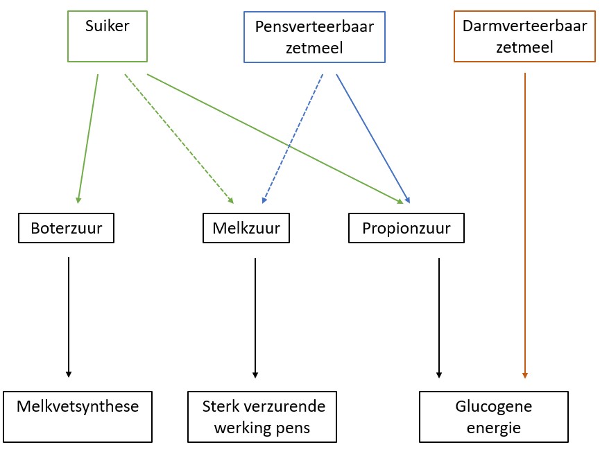 De suikers zijn zeer snel verteerbaar. Ze worden door de pensflora omgezet tot melkzuur, boterzuur en propionzuur. Het propionzuur zal kunnen dienen voor de glucogene energievoorziening van de koe. Boterzuur kan dan weer een bijdrage leveren aan de melkvetsynthese. Het melkzuur is echter dermate verzurend voor het pensmilieu dat de pH te sterk kan dalen om zo te komen tot de afdoding van het microbieel leven in de pens.