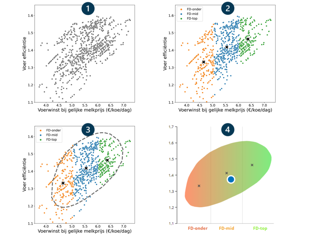 In stap 1 worden de gefilterde meetpunten uitgezet in relatie tot de voerwinst bij gelijke melkprijs (in dit voorbeeld de voer efficiëntie).