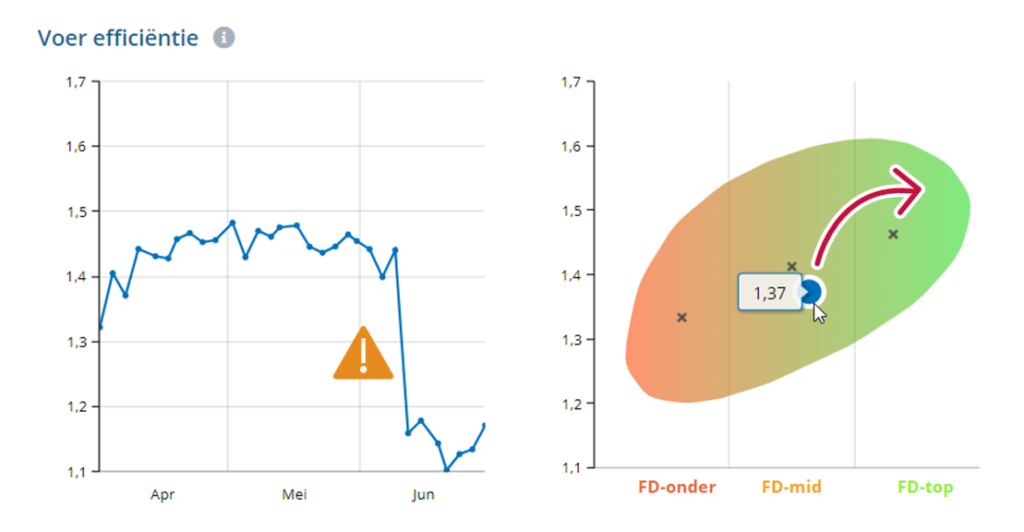 De Farmdesk prestatie indicatoren laten een eenduidige interpretatie toe. In de figuur hieronder wordt opnieuw als voorbeeld voer efficiëntie gebruikt.