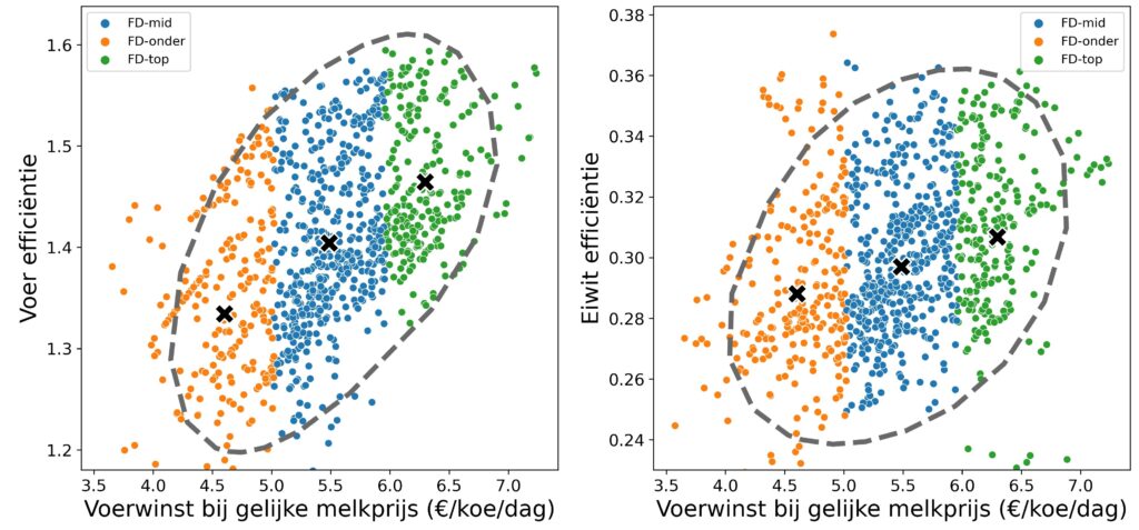 Op onderstaande figuur worden de groepen FD-onder (25% veehouders met laagste voerwinsten) , FD-mid (25-75%) en FD-top (75-100%) weergeven, alsook de gemiddelden van elke groep (de zwarte kruisjes). De distributiewolk geeft meer inzicht in de trend van de metingen.