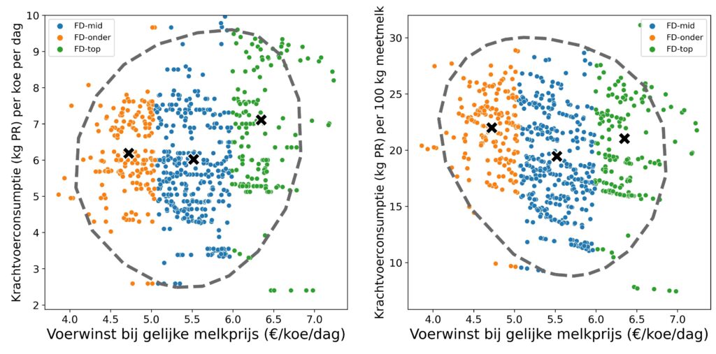 Ook voldoende krachtvoeropname is belangrijk. Uit de onderstaande linker figuur is duidelijk dat de dieren met de grootste krachtvoeropname horen bij bedrijven die de hoogste voerwinsten noteren.
