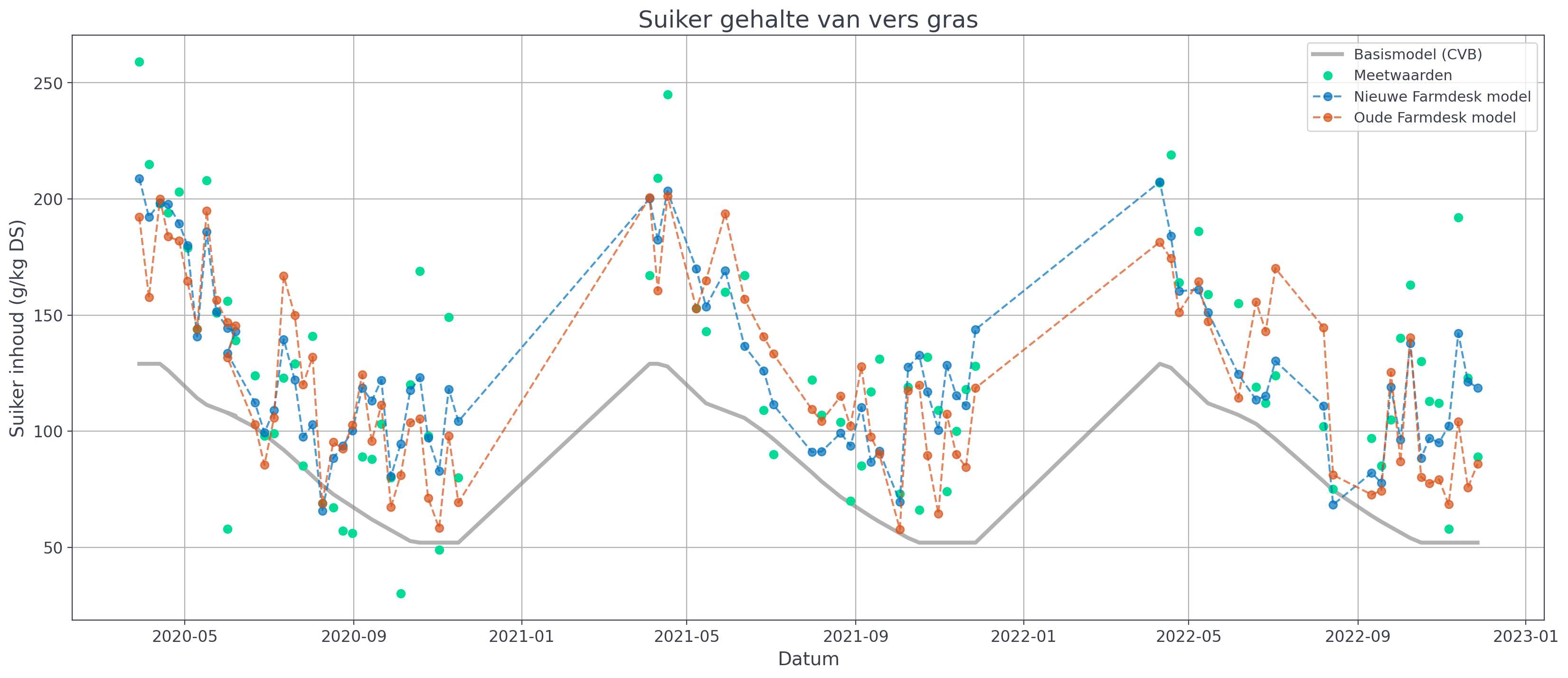 Voor suiker wijkt het nieuwe model in 50% van de meetpunten minder dan 15 g/kg DS af van de gemeten waarde (op een gemiddelde waarde van 120 g/kg DS voor dit bedrijf), waar er in het oude model nog een afwijking van 22 g/kg DS is. Merk ook op dat voor dit testbedrijf de meetwaarden en het Farmdesk model voor suiker systematisch hoger liggen dan de CVB curve.